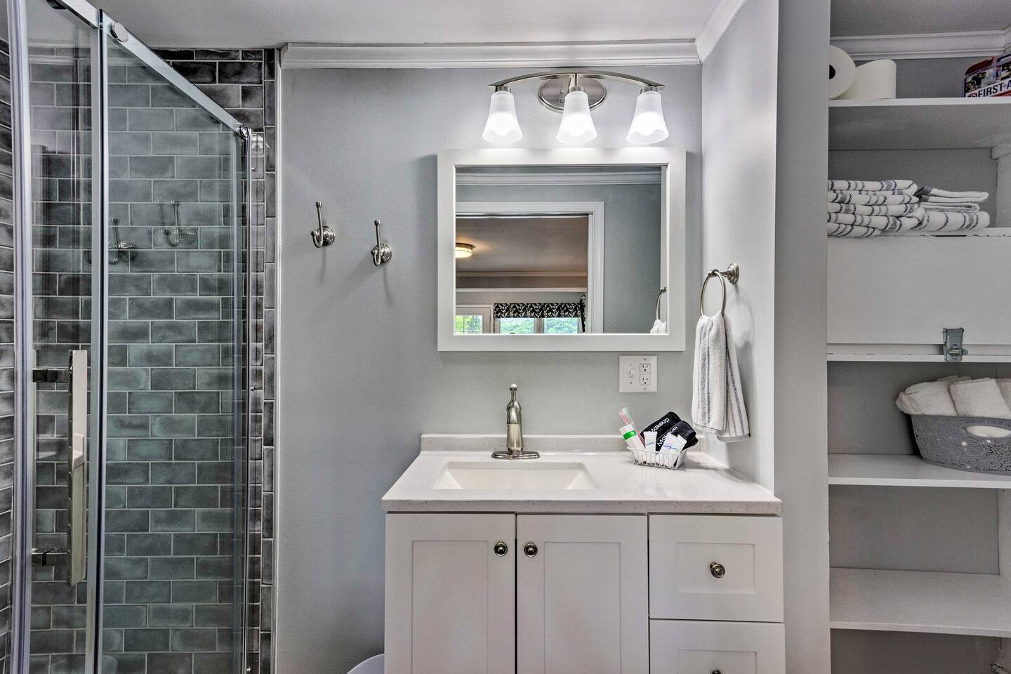 There is one beautifully renovated, full bathroom in this home, stocked with shampoo, conditioner, body wash, towels, hand towels, makeup towels, and toilet paper. The shower in this bathroom also features a detachable shower head to ensure a deep clean.